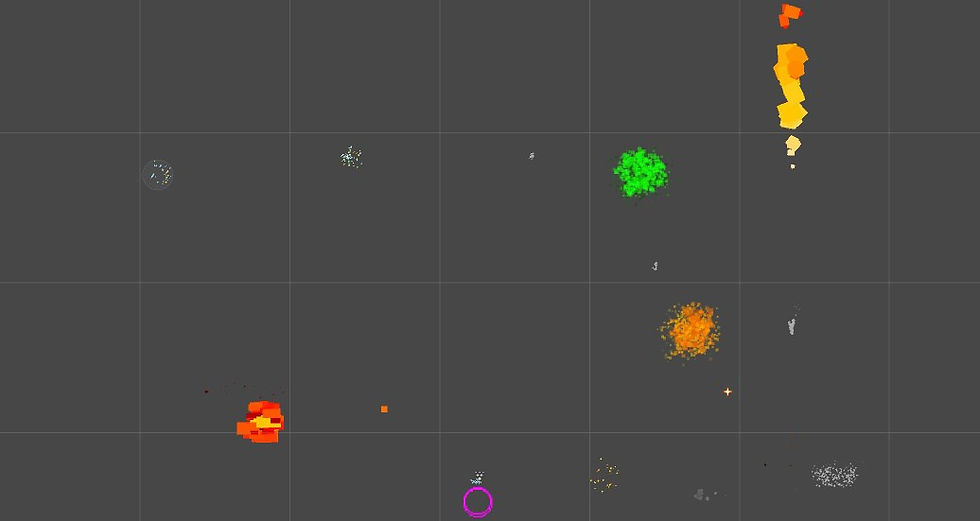 If the weapon hits another player, they will take damage. The player can also throw a repulsive grenade, a classic grenade and a molotov. The throwing mechanic works the same way on all three, the only difference is that the repulsive grenade sends out shock-waves that pushes back any player hit by it, a kind of knock back. The classic grenade explodes after some seconds like a normal grenade would have. The molotov explodes directly when landed on the ground, it creates fire in a certain area and if a player gets hit by the fire they will caught on fire and can be spread among the players. For example, a player caught on fire and ran into another player, then that player also will be caught on fire. All of these attacks and effects need particle effects, which is a total 70% complete. Here is a picture of some particle effects that is active: